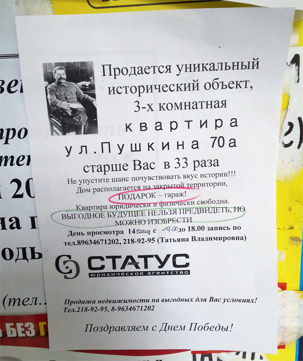 Алексей рекомендует уникальную квартиру, которой как минимум девятьсот лет. И правда - уникальный исторический объект. Только при чем тут усатый душегубец - непонятно. Там должен быть какой-нибудь Ярослав Мудрый. Который был прозван мудрым за свою мудрость.