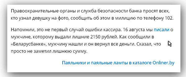 Ну, контекстная реклама понятно, что любая может быть. Меня больше само сообщение удивило. Это что, если кассир ошибётся, то мои фото по "Их разыскивает милиция" развесят и будут с ней же и искать? Капец какой-то. Недаром в Беларусбанк не хожу, хоть и ближе всего к дому.