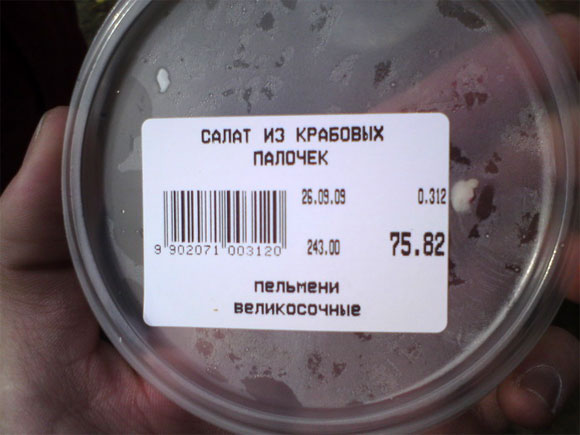 Вот поди пойми, что там внутри. Оказалось, впрочем, что там действительно салат из пельменных крабовых палочек великосочных.