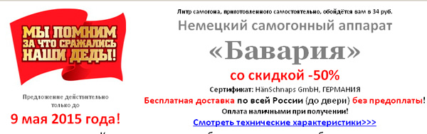 Мне несколько человек прислали этот спам от ублюдков, торгующих "немецкими самогонными аппаратами". Ублюдки, как мы выяснили, помнят, за что сражались наши и их деды. Их деды, я так понимаю, давно умерли, иначе бы они этим веселым ребятам засунули немецкие самогонные аппараты именно туда, где им самое место.