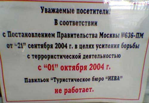 Все, теперь нечего бояться! Павильон туристического бюро ликвидирован, так что теперь террористы не получат визы и не смогут купить билеты, чтобы вылететь по своим террористическим делам! От этого они расстроятся и переквалифицируются из террористов в управдомы!