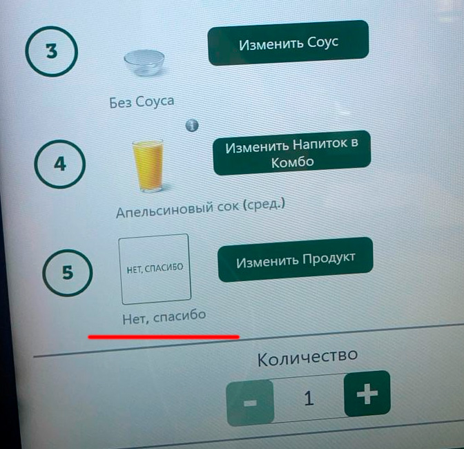 Милена пытается понять, на что тут можно изменить продукт "Нет, спасибо" в "Биг Спешиал Комбо" - на "Да, пожалуйста", что ли?