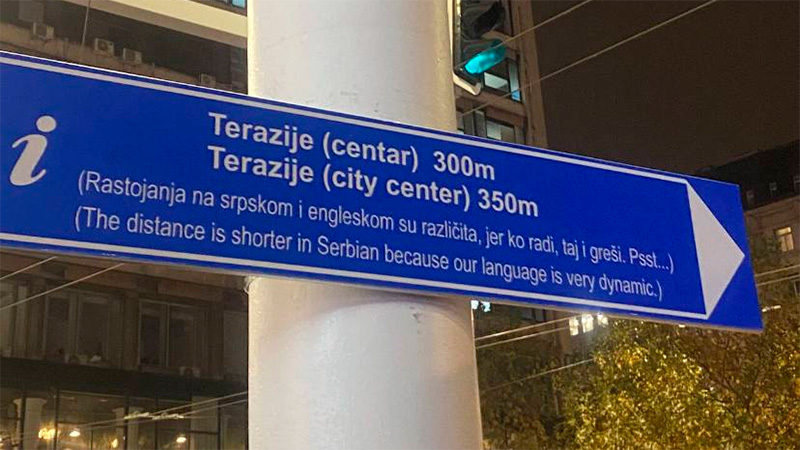 Антон прислал вывеску из Белграда. Там указано расстояние до центра города на сербском и на английском. Надпись на английском: "Расстояние меньше в сербском языке, потому что наш язык - очень динамичный. Надпись на сербском: "Расстояния на сербском и английском различны, потому что кто работает, тот и ошибается. Тссс…"