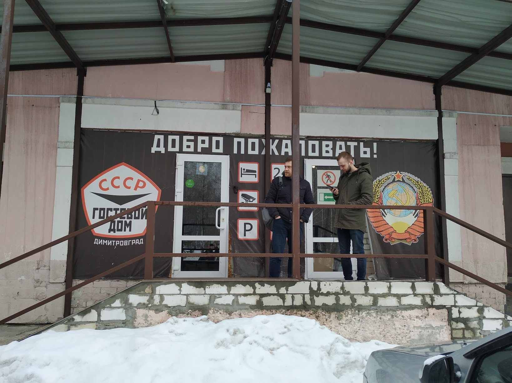 Кстати, там где Отель СССР на табличке на стене всё же "Гостиница", так что вахтерша вполне может оказаться внутри.