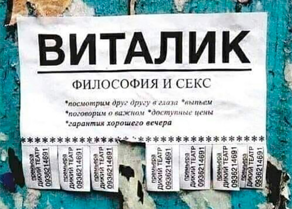 Бухарь-разговорник с сексуальным уклоном предлагает свои услуги, рассказал Антон. Возможна работа за еду и алкоголь. Темы для разговора может задавать собеседник, однако Виталик отказывается обсуждать проблему Геттиера и беседовать на тему дуализма и панпсихизма.
