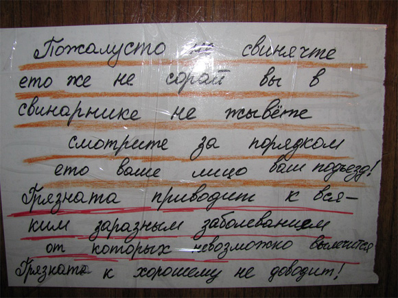 Медведь-хохотун: Объявление написано с ошибками нарочно, чтобы малограмотным гражданам (к которым оно и обращено) было легче понять написанное.