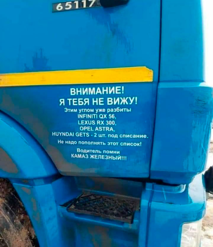 Фото внизу из статьи "Зеркало мёртвой зоны для КАМАЗ". А сабжевого камазиста уже за одну только эту надпись, смысл которой "да, я — чмо, но мне насрать" следует подвергнуть анальному наказанию.