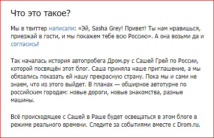 Её пригласили на автопробег на Ладе «Калине» примерно в тоже время когда был такой же пробег у бывшего премьер-министра. Саша Грей специализируется на сексе с механизмами (простите, не знаю как это правильно называется). Так вот, после автопробега она сказала, что Лада «Калина» ей не понравилась. Ломалась, не заводилась, не комфортная что-то там еще. Иными словами — «натрахалась», а удовольствия не получила. А вот у СамиЗнаетеКого впечатления от машины остались хорошие. Т.е. профессионал на трахе с железными механизмами не был удовлетворен от взаимодействия с машиной, а другой — наоборот.