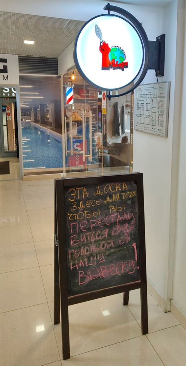 С доской и вывеской хорошо задумано. Реклама-дуплет.