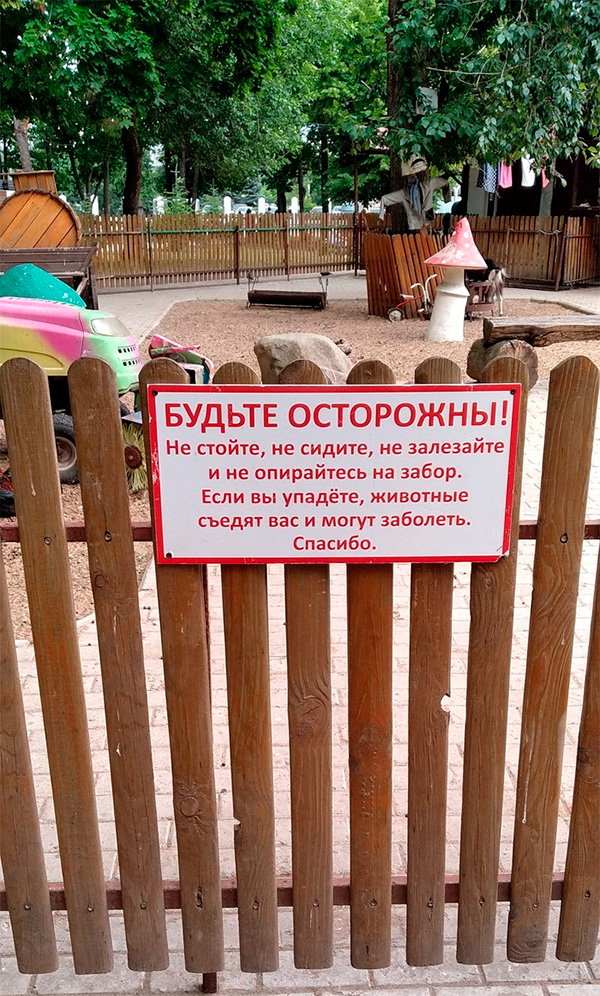 Предупреждение про животных висит не на детской площадке, а на огороженном участке, где по принципу контактного зоопарка гуляют всякие не сильно опасные для здоровья животные (козы, овцы и пр.). Там типа кусок деревенского двора воспроизведен. По крайней мере, в нашем городе есть очень похожая. Вероятно, что фото как раз оттуда.