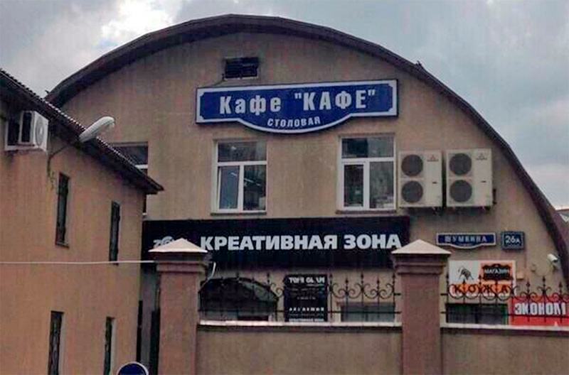 А и правда, креатив так и прет, радуется Гена Крокодил. Впрочем, кафе "Кафе" - это еще не самый продвинутый креатив. Так как данное кафе одновременно является столовой, то намного круче было бы назвать заведение кафе-столовая "Кафе-столовая".