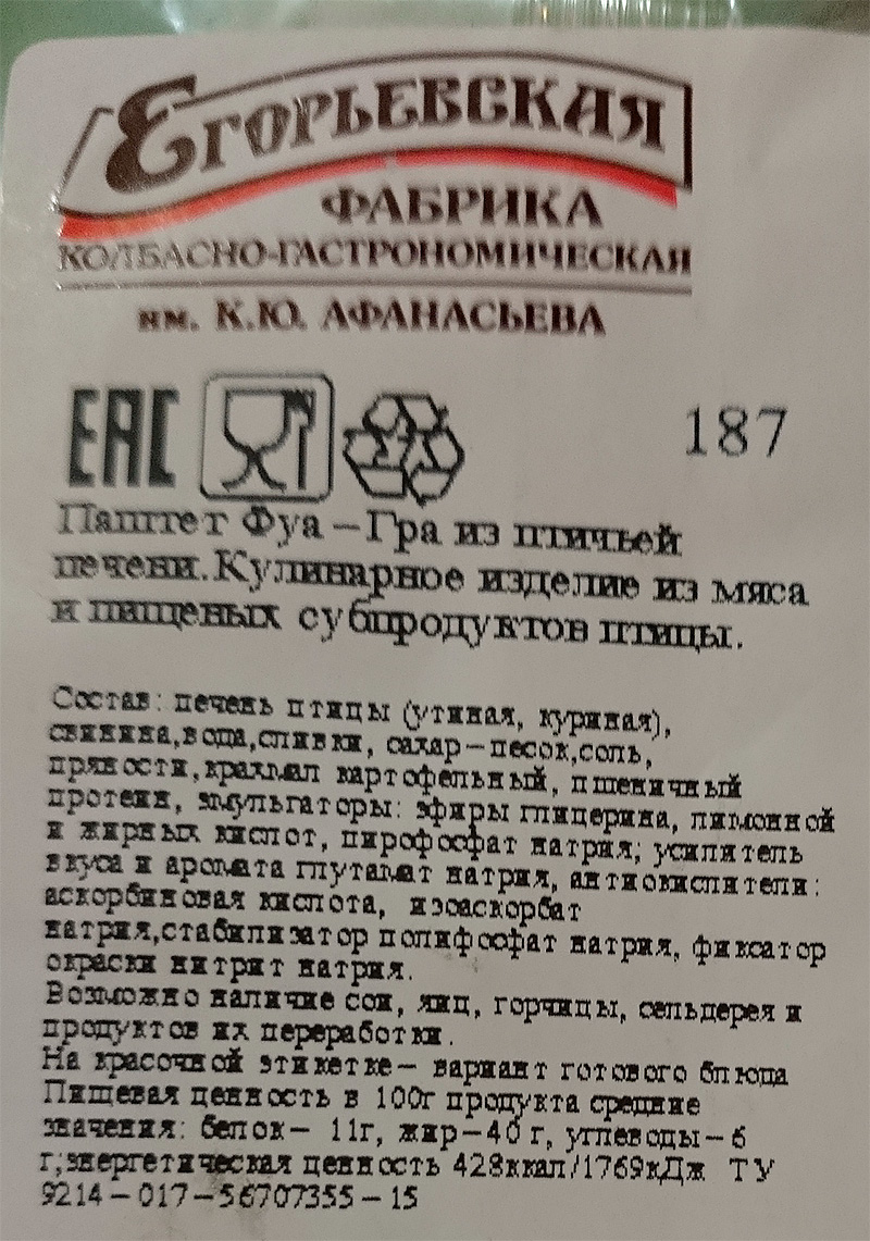Понятно, что Егорьевская "Фуа-гра", к настоящей фуа-гра отношения не имеет, но как паштет - это вкусно за разумные деньги, рекомендую попробовать.