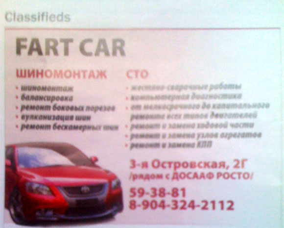 Какое прекрасное название для автосервиса, умиляется Леонид. Вообще, они, конечно, правы. Назвать фирму "Пердящая машина" - как-то чересчур. А вот по-английски Fart Car - звучит поприличнее. Для тех, кто английский не знает.