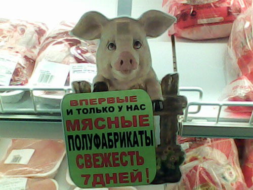 Впервые и только у них, рекламирует Hauptmann! Если учесть, что мясные полуфабрикаты больше трех дней в холодильнике не лежат, полуфабрикаты по акции уже четыре дня как сдохли. Так что непонятно, с чего свинка-то радуется.
