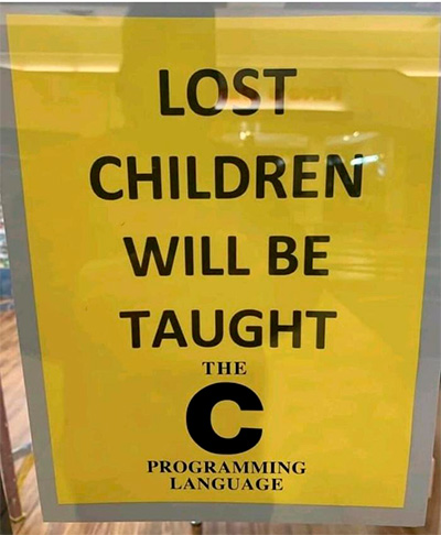 Надпись на плакате: "Потерявшиеся дети будут обучены языку программирования "Си"", ужасается Денис