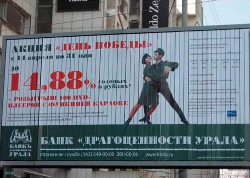 Сейчас за такую рекламу банку бы не поздоровилось. Подрыв устоев. Глумление. Оскорбление ветеранов и прочий терроризм.