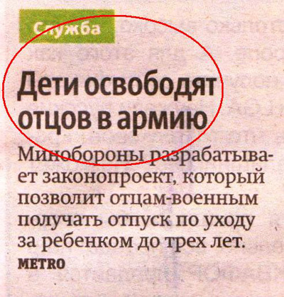 Заголовок, считает Павел, отображает истинный смысл заметки: отцы-военные так замучаются с детьми, что сбегут снова в армию.