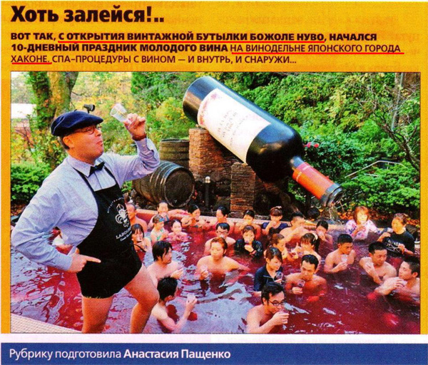 В заметке все прекрасно. И "винтажная бутылка" вина, которое не живет и года, и 10-дневний праздник "Божоле Нуво" во Франции, который проходит в спа-процедурах японского города. Вот ведь точно Анастасия Пащенко перепила этой прокисшей бурды под названием "божоле нуво".