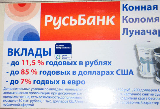 "Все срочно в "Русь-банк", срочно!" - призывает Александр. Потому что если вам не дадут 85% годовых в долларах - можете спокойно подать на банк в суд за прямой обман в рекламе.