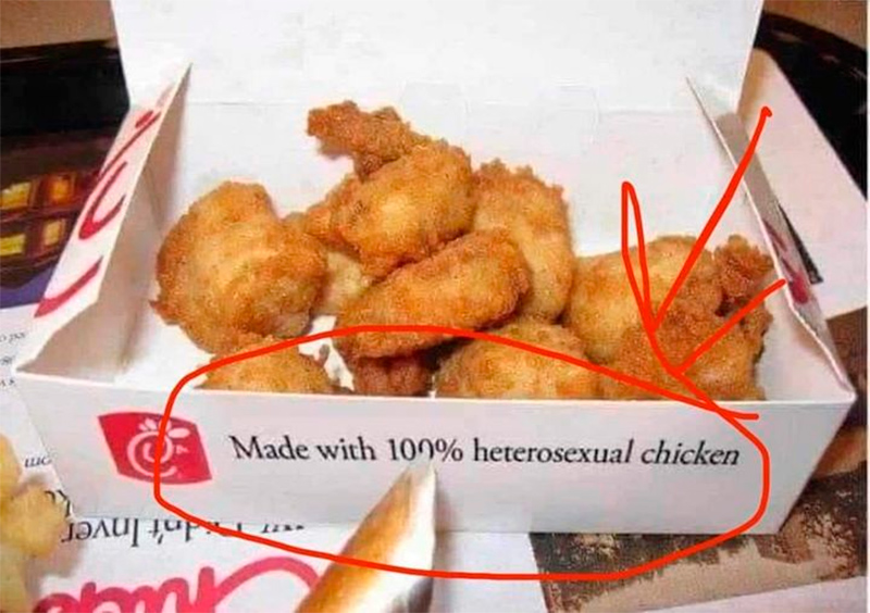 А наггетсы он всегда делает из стопроцентно гетеросексуальных цыплят, вы можете быть совершенно спокойны!