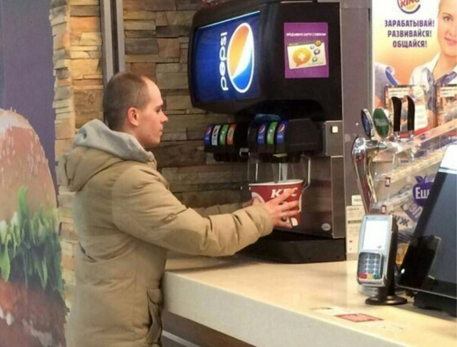 В KFC когда ты платишь за напиток, тебе выдают пластиковый стакан соответствующего размера (за который заплатил), а напиток ты наливаешь себе сам. Но они не учли смекалку недорогого россиянина, который обоссытся, но нальет побольше на халяву.