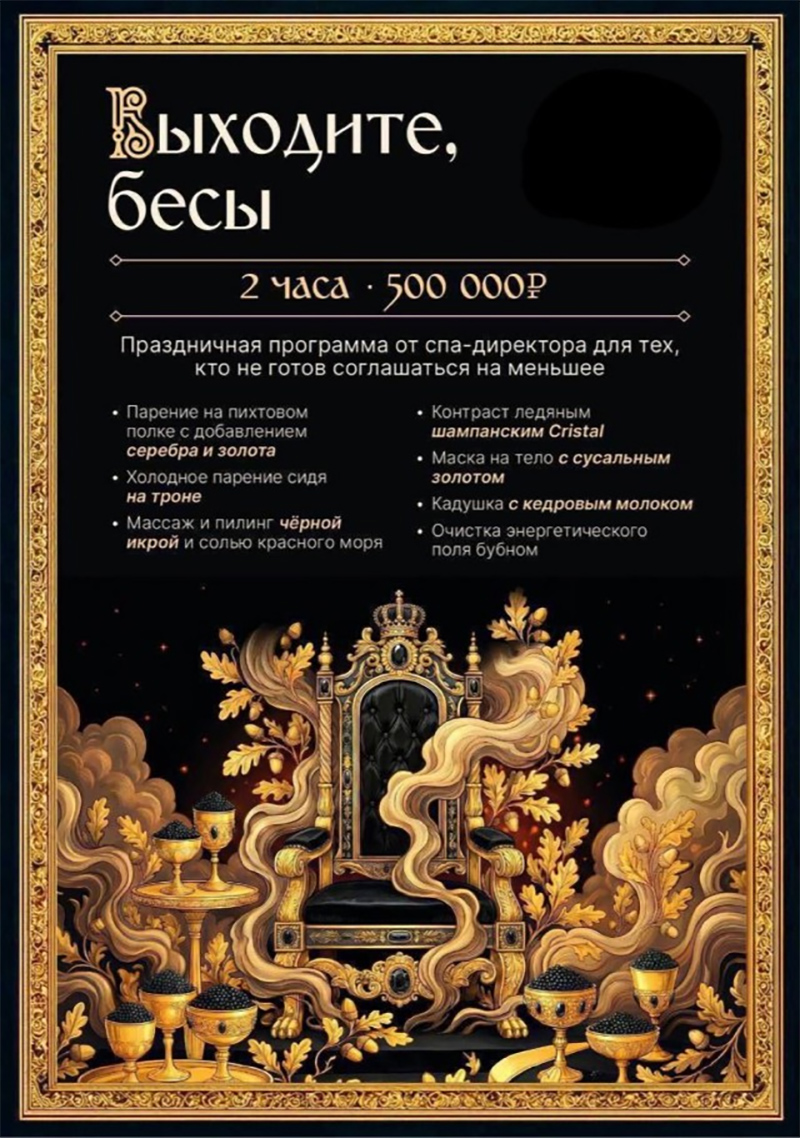 Нельзя не признать, что праздничная программа от спа-директора хорошо продумана. В конце концов, что такое полмиллиона за 2 часа? Зато массаж и пилинг черной икрой и очистка энергетического поля бубном! Бесы после эдакого ка-а-а-а-ак прыгнут!