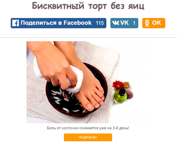 А что тут непонятного, удивляется Андрей. Мочите тряпочку в торте, протираете подъем стопы. Тут только главное, чтобы бисквитный торт был без яиц - и боль от косточки снимается уже на 3-й день.
