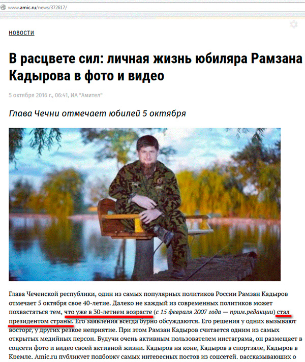 А что не так с Кадыровым? Если ему 5 октября сего года наступило 40, то вполне логично, что в феврале 2007 года ему было 30 лет. В чем подвох?