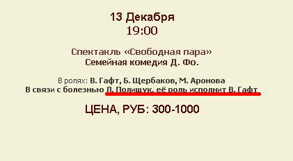 А в связи с болезнью Щербакова его роль исполнит Аронова. А в связи с болезнью Ароновой ее роль исполнит осветитель.