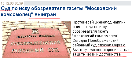Но с другой стороны, этот воинствующий протоиерей суд выиграл, поэтому в заголовок внесли "выигран". Теперь заметку можно не читать. Суд по иску обозревателя "МК" выигран. Точка. А кем - истцом или ответчиком - это уже не имеет особого значения.
