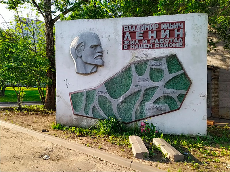 И про Ленина тоже всё абсолютно верно. На стеле изображён нынешний Ленинский район Московской области, в который входит и Бутово, и Горки Ленинские (ранее - Вышние Горки), где как раз некоторое время жил и работал Ленин.