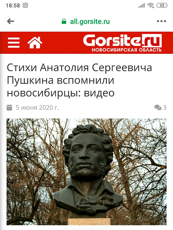Конечно же, новосибирцы помнят и любят стихи своего знаменитого земляка - Анатолия Сергеевича Пушкина, а также его бессмертные поэмы "Бородино" и "Василий Теркин-Разборкин".
