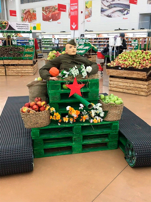 Ашановский креатив к 23 Февраля. Прям даже страшно предположить, что они сотворят к 8 Марта! Но зато хоть дуло у солдатика из правильного места торчит, сказал кот Бублик.