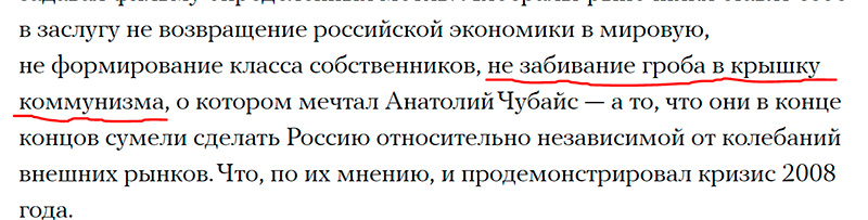 В статье "Медузы" про Чубайса, помимо прочего, сформулировано так, как будто Анатолий Борисович мечтал именно о коммунизме, а не о крышке, гробе и т.д.