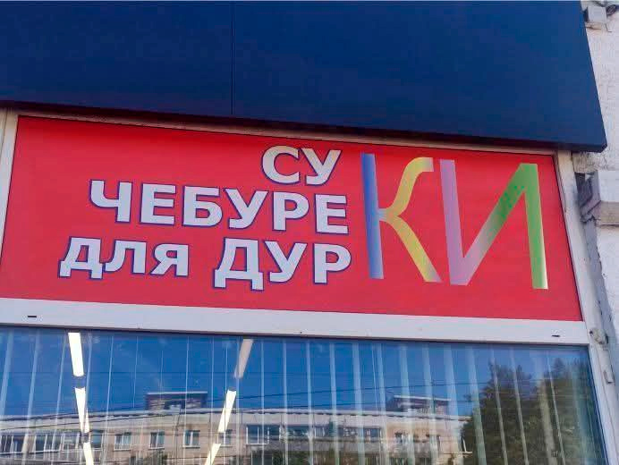 Константин пытается понять, что творец хотел сказать этой вывеской. Суки чебуреки для дурки? Или Су чебуреки для дур? В любом случае, с этими чебуреками творится какая-то загадочная хрень!