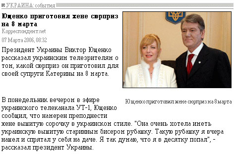 Виталий Тимчишин надеется, что за следующие сутки, оставшиеся до 8 Марта, жене Ющенко никто не сказал о подарке. Ни УТ-1, ни РИА "Новости", ни "РБК", ни "Первый канал", ни даже CNN с BBC. Все молчали, как партизаны. Ну, точнее, конечно, рассказали, но шепотом-шепотом. Все-таки сюрприз. О нем можно рассказать только самым близким людям - средствам мозгового истощения.