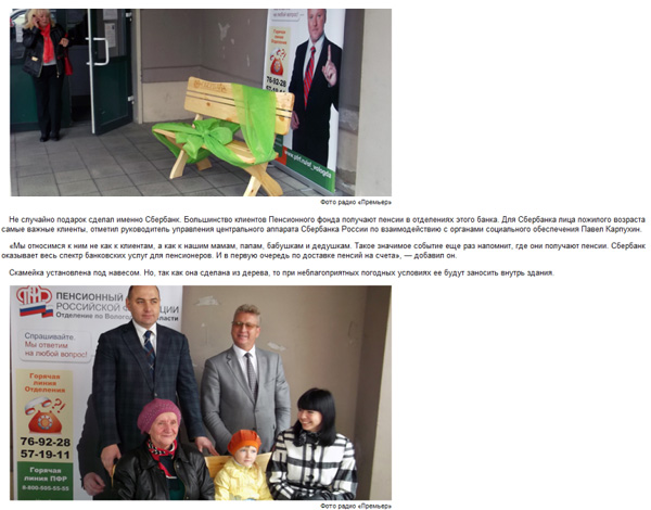 Сбербанк подарил Пенсионному фонду деревянную скамейку. Как трогательно, сказал Антон и зарыдал от чувств-с.