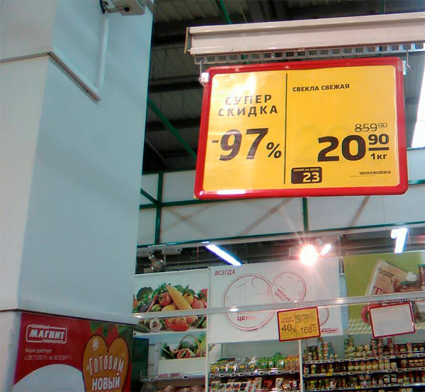 Но если китайцам фиктивно повышать цену больше чем на двадцать-тридцать процентов не позволяет коммунистическая сознательность, то у маркетологов "Магнита", как выяснилось, никакой сознательности, а заодно и совести нет вообще: они просто тупо повысили цену в сорок раз, а потом сообщили о 97-процентной скидке. Видимо, они уверены, что в магазины "Магнит" ходят только законченные тупоголовые идиотские дебильные кретины. Ну, кому, как не маркетологам, знать свою аудиторию, правильно?