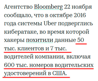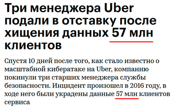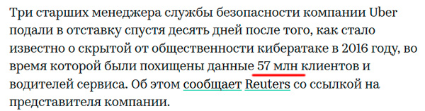 А потом выясняется, что это было не 57 миллионов, а 57 тысяч. Причем для 7 тыс. водителей компании - включая 600 тыс. номеров водительских удостоверений в США.