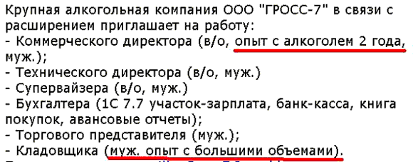 Ну, кто желает? У кого опыт с алкоголем не менее двух лет? Я бы сам пошел, но не гожусь я для них. Больно вкусы изысканные. Не могу потреблять этот лесоповал. Да и мужской опыт у меня вовсе не с такими большими объемами...
