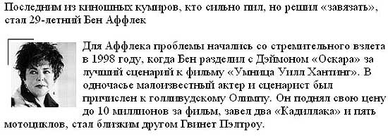 Дима рассказал нам шокирующие подробности о красавчике Бене Аффлеке. Вы посмотрите, до чего допился симпатяшка Бен. На кого он только стал похож - это же ужас просто! Кодировать парня, кодировать - однозначно! Это же прям белка - белая горячка! Один мой друг допился до того, что примерно так же и выглядел. Правда, у него не было пяти мотоциклов...