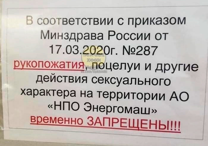 Ирина пытается понять, с каких это пор рукопожатия стали действием сексуального характера, а также что вообще раньше творилось на территории АО "НПО Энергомаш" до приказа Минздрава России. Хорошо хоть, всевозможные действия сексуального характера на территории АО временно запрещены, так что надежда-то есть!