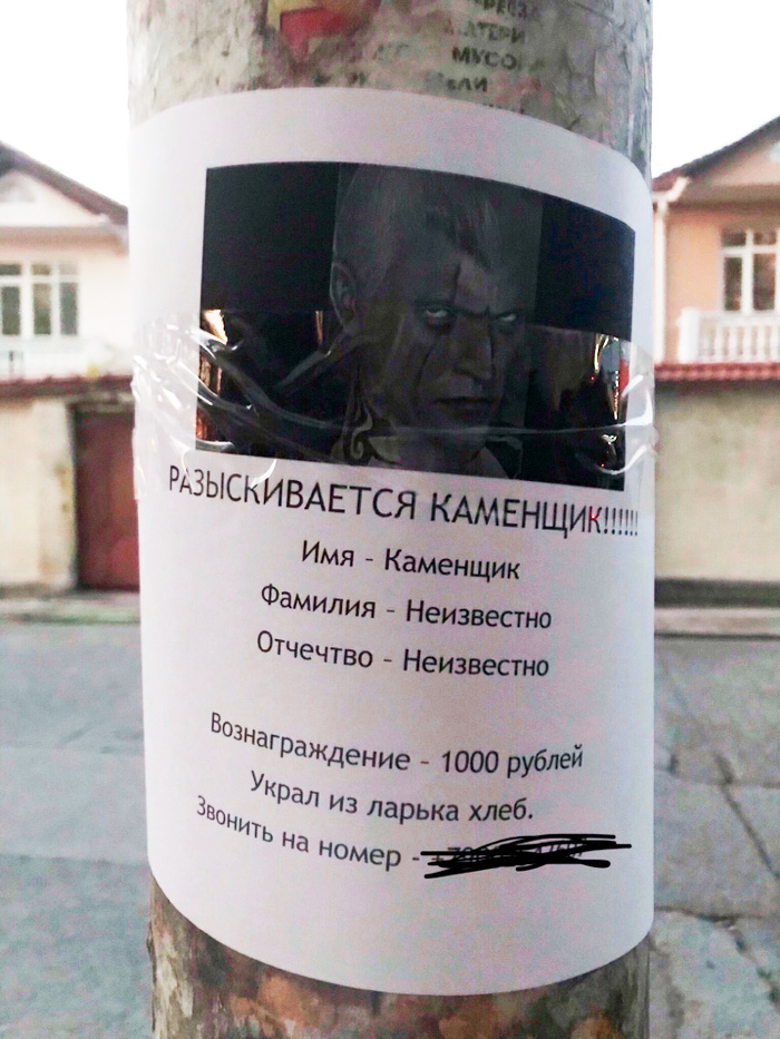Это сколько ж хлеба спёр тот вольный каменщик, что обещано вознаграждение аж в 1000 рэ? Учитывая, что если и удастся вернуть спёрнутый хлеб, то он будет уже в непродажном виде.. Хотя... может, там в булочку жемчужина Борджиа запечена?