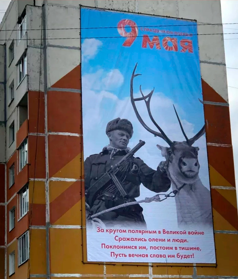 Слава богу, с оленями люди все-таки уже отвоевали, чему можно только порадоваться. Олени были побеждены, и у них были реквизированы рога. Правда, не очень понятно, что на плакате делает финский пограничник с финским же оленем, но надпись "Праздник 9 мая" многое объясняет: под эту надпись нынче любой идиотизм прокатит, для победобесия ничто не слишком.