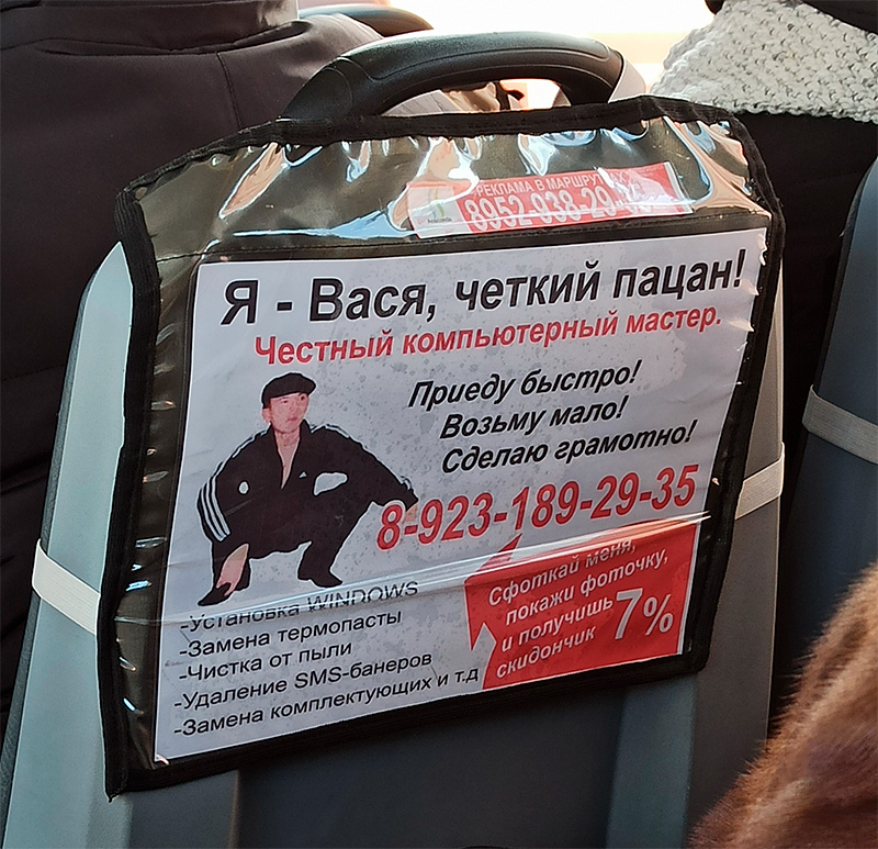 "Челябинский" айтишник, пожалуй, всё-таки Новосибирский. У меня фотографии нет, но видел это объявление. Да и номер 923 - это мегафон у нас, а 952 (вверху) теле-2. Понятно, что жесткой привязки нет, но всё же.
