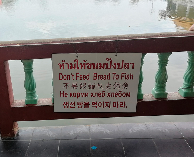 Тайский "хлеб хлебом" - фотошоп. Реальный косяк, в оригинале запрещается кормить рыб сладким хлебом. В переводах редуцировалось до просто "хлебом".