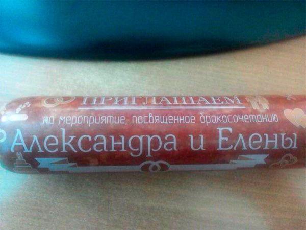 А что, по-моему, просто гениально! Какую-то открытку посмотрел да выбросил. А сервелатик слопали всей семьей и пожелали молодым - совет да любовь, ну и детишек побольше. И дом - полная чаша, где никогда не переводится колбаса.
