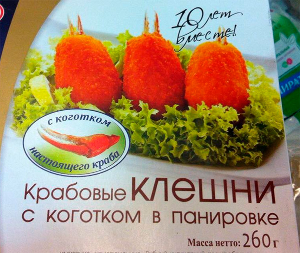 Натуральный продукт, советует Ольга. Сделано, конечно, из рыбной муки, но зато коготок - натурального краба. Еще и в панировке коготок - налетай! Причем коготок 10 лет вместе с клешней - ну кто тут устоит-то?!!