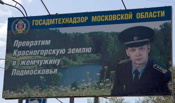 "А ну, твари, быра превратили красногорскую землю в жемчужину Подмосковья, а то урою, суки", - как бы говорят нам эти прекрасные глаза сотрудника Госадмтехнадзора. Кстати, они там в Госадмтехнадзоре еще и безграмотные - "красногорская" в данном случае пишется с маленькой буквы. Впрочем, с таким волевым взглядом родной язык знать уже совершенно необязательно.