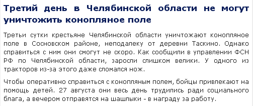 Я так думаю, что школьники и студенты Москвы и Московской области должны помочь товарищам и отправить в Челябинскую область специальный молодежный рейд под лозунгом: "Не оставим ни грамма конопли врагу!"